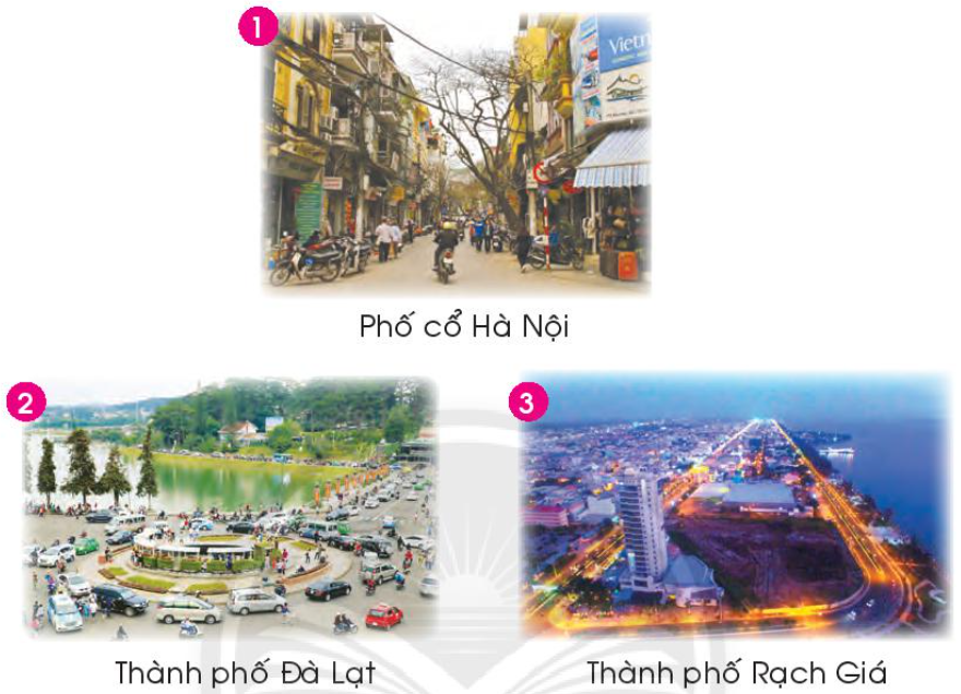 - Bức ảnh chụp cảnh ở phố cổ Hà Nội, thành phố Đà Lạt và thành phố Rạch Giá.