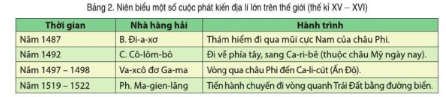 Đọc thông tin và quan sát lược đồ 2, bảng 2, hãy trình bày những nét chính về hành trình của một số cuộc phát kiến địa lí lớn.