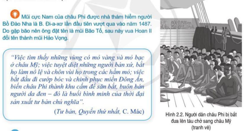 - Năm 1487, B. Đi-a-xơ đi tới được mỏm cực Nam châu Phi thì bị bão tố đẩy ra xa bờ, khi quay lai, đoàn bất ngờ đi vòng qua điểm cực Nam của lục địa châu Phi và đặt tên nó là mũi Bão Tố, về sau được đổi thành mũi Hảo Vọng.