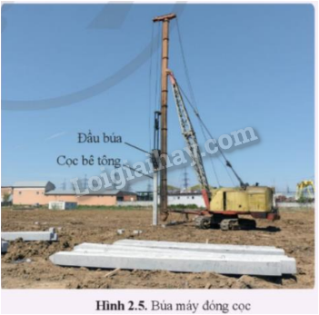 Trên công trường xây dựng, để đóng các cọc bê tông lún sâu xuống lòng đất, người ta dùng búa máy như hình 2.5. Đầu búa có trọng lượng lớn được kéo lên một độ cao nhất định so với mặt đất rồi thả rơi xuống đập vào cọc bê tông.