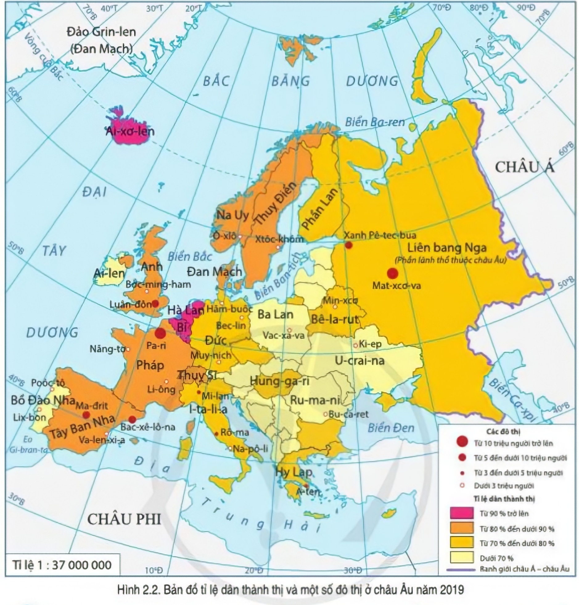 Đọc thông tin đặc điểm đô thị hóa ở châu Âu và quan sát hình 2.2.