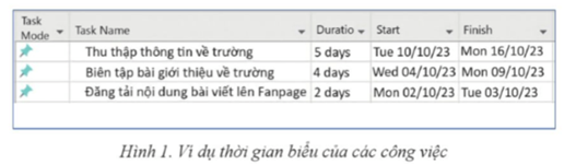 Trong trang tính các công việc (Task Sheet) của dự án (Hình 1), bên cạnh tên các công việc chính (cột Task Name), có thể thiết lập thời gian hoàn thành từng công việc đó dựa trên : thời gian thực hiện (cột Duration) và thời điểm bắt đầu (cột Starf). Hãy sử dụng MS Project để thiết lập thời gian hoàn thành cho các công việc chính của dự án “Fanpage trường THPT An Thọ” như ở Hình 1.