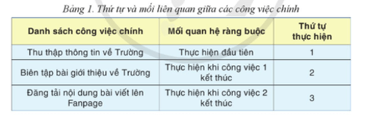 Em có nhận xét gì về thời gian biểu thực hiện các công việc của dự án như đã nhập theo Hình 1 khi đối chiếu với thứ tự thực hiện chúng cho ở Bảng 1. Hãy dùng MS Project để thiết lập các ràng buộc về thứ tự thực hiện giữa các công việc chính của dự án xây dựng “Fanpage Trường THPT An Thọ".