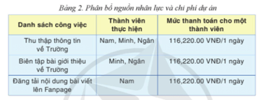 Sau khi thiết lập bảng các công việc chính và thời gian hoàn thành tương ứng, nhóm ZenTech cần phải phân bổ công việc cho từng thành viên và tính toán chi phí cần thiết. Hãy sử dụng MS Project để giúp nhóm Zen Tech nhập thông tin về phân bổ nguồn nhân lực và chi phí cho dự án như được chỉ ra ở Bảng 2.