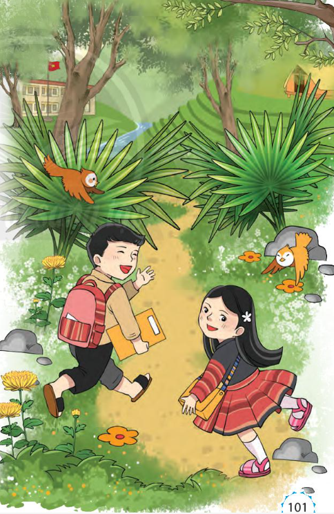Các bạn nhỏ trong tranh đang đi đâu. Đi học. Tìm ngoài bài thơ từ ngữ chứa tiếng có vần ươn, ương. Đọc các câu thơ trong bài tương ứng với nội dung từng bức tranh. Học thuộc hai khổ thơ cuối. Hỏi đáp với bạn về những hình ảnh em thích trên đường đến trường. Hát bài Đi học (nhạc: Bùi Đình Thảo, thơ: Minh Chính).