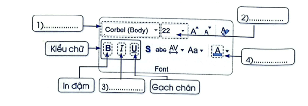 Trong hình minh họa của nhóm lệnh Font, thuộc dải lệnh Home, em hãy điền tên cho các lệnh định dạng sau đây: