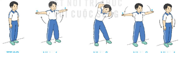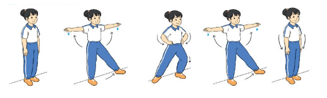 - Nhịp 1: Chân trái đưa sang ngang (bàn chân không chạm đất), hai tay dang ngang, bàn tay sấp.