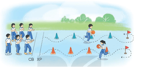 - Bước 1: Chuẩn bị 2 quả bóng rổ, 2 lá cờ, 8 vật cản (tùy theo số đội chơi). Kẻ vạch chuẩn bị và vạch xuất phát cách nhau 50 cm. Cách vạch xuất phát khoảng 15 m, cầm một lá cờ làm đích, từ vạch xuất phát đến đích đặt 4 vật cản, mỗi vật cản cách nhau khoảng 3 m.