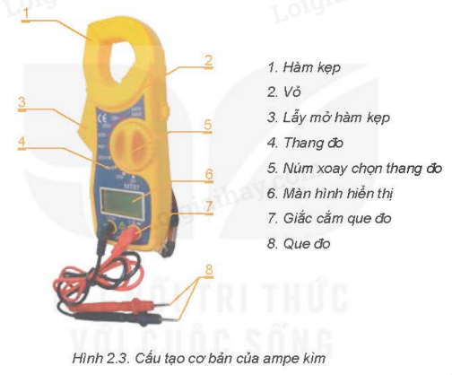 Quan sát Hình 2.3 và cho biết: Ampe kìm có những bộ phận cơ bản nào?