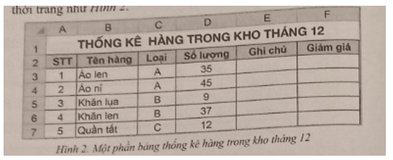 Cho một phần bảng thống kê hàng tồn kho tháng 12 của một cửa hàng thời trang như hình 2.