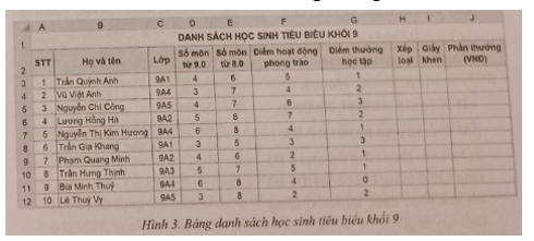(Thực hành): Hình 3 là bảng danh sách học sinh tiêu biểu khối 9 của một trường trung học cơ sở.