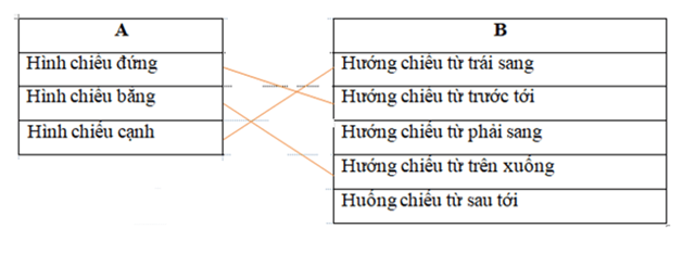 Hãy nối tên hình chiếu nhận được trên mặt phẳng hình chiếu ở cột A với hướng chiếu ở cột B cho phù hợp.
