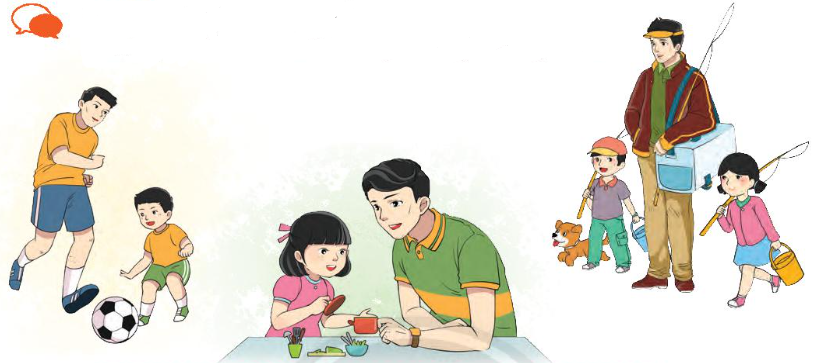 Các bạn nhỏ đang chơi đá bóng, chơi đồ hàng, đi câu cá cùng với bố.
