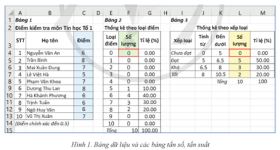 Trang tính ở Hình 1 có ba bảng dữ liệu. Điểm kiểm tra môn Tin học của học sinh Tổ 1 trong một lớp được nhập ở Bảng 1. Từ đó, số lượng và tí lệ phần trăm từng loại điểm được thống kê ở Bảng 2 và Bảng 3. Sự khác nhau giữa hai bảng thống kê Bảng 2 và Bảng 3 gồm các điểm sau: