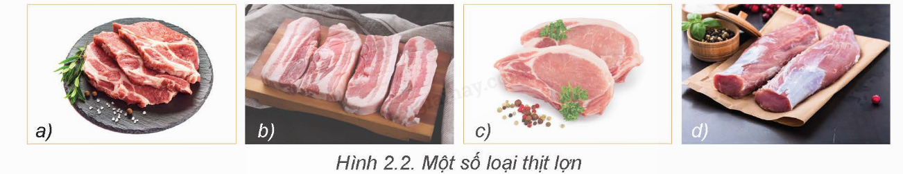 Kết hợp nội dung đã học và hiểu biết cá nhân, hãy phân biệt các loại thịt lợn trong Hình 2.2 dưới đây và nêu cách lựa chọn thịt lợn tươi ngon.