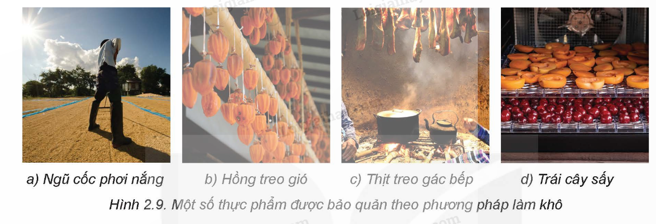 Dựa vào nội dung mục II.1b, hãy cho biết tên gọi của các phương pháp làm khô thực phẩm trong hình Hình 2.9.