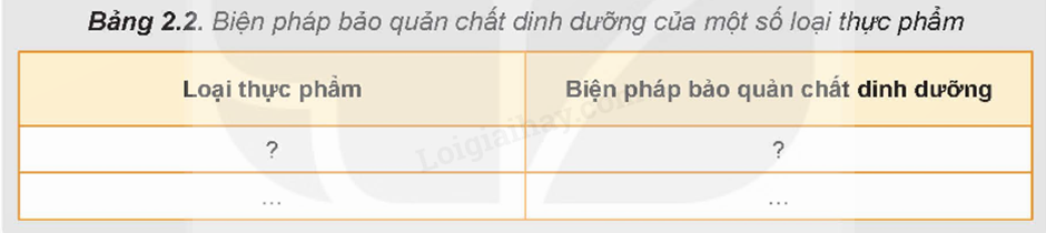 Dựa vào kiến thức của mục II, kết hợp với các thực phẩm trong thực đơn của gia đình em, hãy hoàn thành nội dung theo mẫu Bảng 2.2 với các biện pháp bảo quản chất dinh dưỡng trong thực phẩm trước khi chế biến.