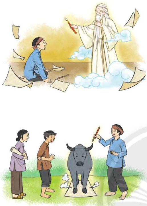 Vâng lời bụt, anh vẽ trâu bò, cày cuốc,… cho dân làng. Rồi anh đi khắp nơi giúp đỡ mọi người.