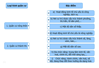 Ghép thông tin ở cột bên trái với thông tin ở cột bên phải cho phù hợp về đặc điểm quần cư nông thôn và quần cư thành thị ở nước ta.