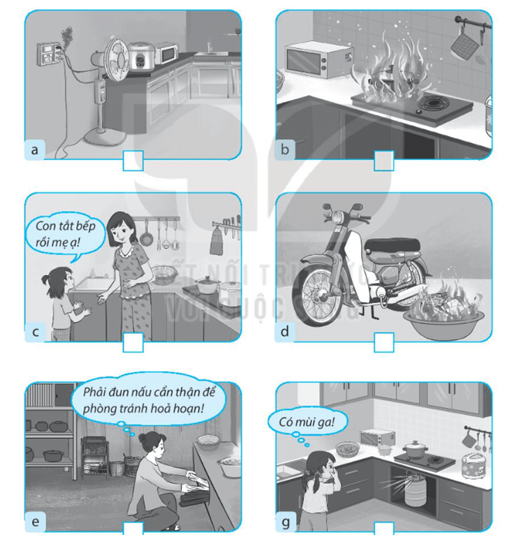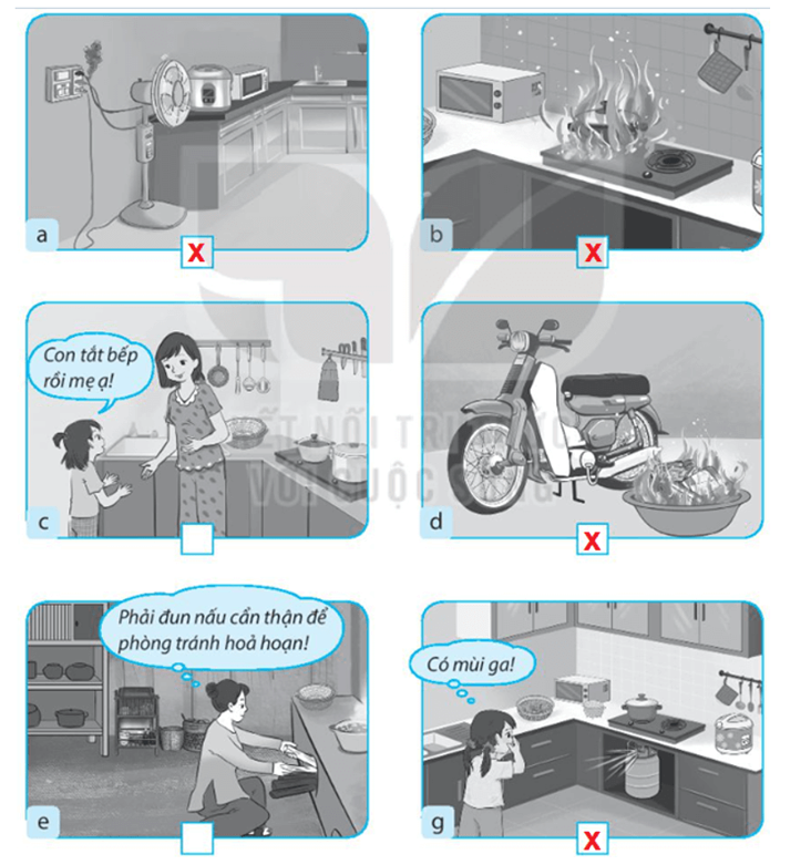 Đánh dấu X vào ô trống dưới các hình thể hiện tình huống có nguy cơ gây cháy nhà.