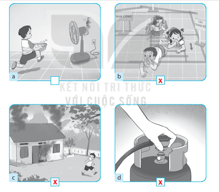 Đánh dấu x vào ô trống dưới các hình xử lí đúng khi có cháy xảy ra.