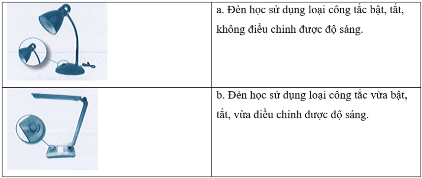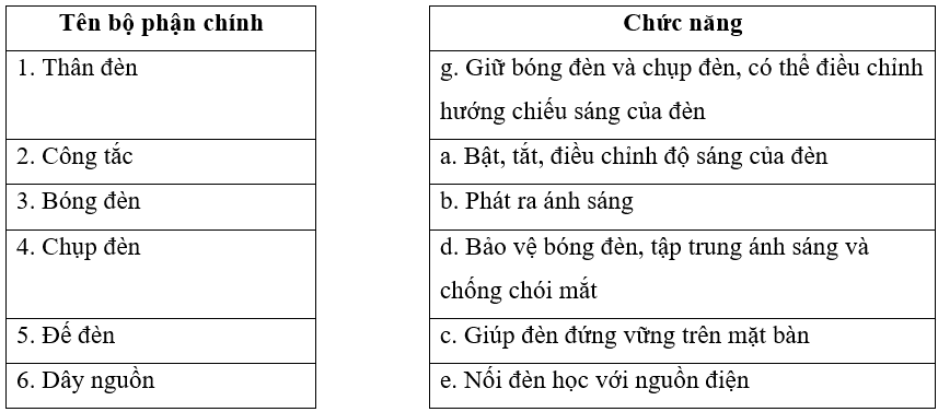 Nối tên các bộ phận chính của đèn học với chức năng của chúng cho phù hợp.