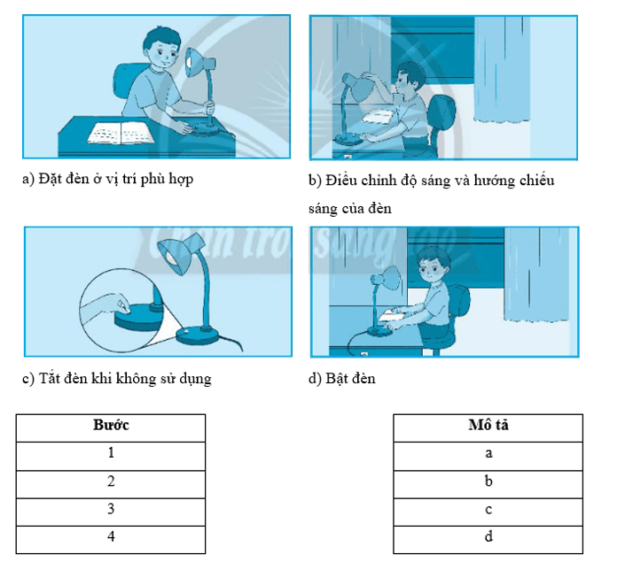 Em hãy quan sát những hình ảnh mô tả các bước thực hành sử dụng đèn học và nối các bước theo thứ tự đúng.
