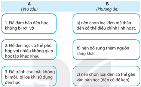 Hãy nối các phương án ở cột B cho phù hợp với các yêu cầu khi lựa chọn và sử dụng đèn học ở cột A