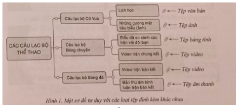 Hãy sử dụng phần mềm tạo sơ đồ tư duy để trình bày thông tin về các câu lạc bộ thể thao ở trường em. Sơ đồ tư duy cần có cả các loại tệp văn bản, ảnh, video và âm thanh đính kèm vào các ô. Có thể tham khảo một trình bày trên hình 1: