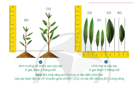 Luyện tập: Quan sát Hình 2.1 và so sánh khả năng sinh trưởng và đặc điểm hình thái của cây bạch đàn lai UP chuyển gene EcHB1 và cây đối chứng cùng dòng.