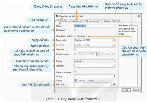 Quan sát hình 2.1 và cho biết tên nhiệm vụ đang thiết lập, ngày bắt đầu, ngày kết thúc, số ngày dự kiến sẽ cần để thực hiện nội dung mô tả bổ xung cho nhiệm vụ này là gì.