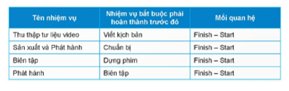 Thiết lập sự phụ thuộc giữa các nhiệm vụ của dự án Xây dựng video kỷ yếu lớp 12A1 theo quy định như trong bảng sau: