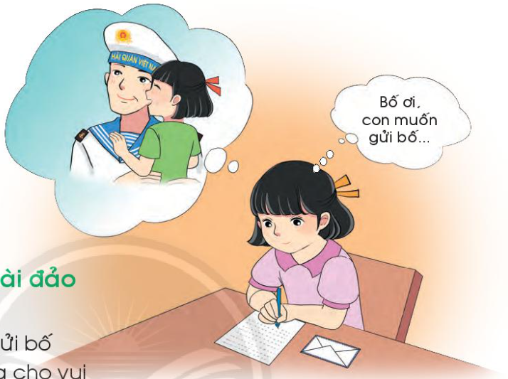 Theo em, bố của bạn gái trong tranh là ai. Thư gửi bố ngoài đảo. Tìm ngoài bài thơ từ ngữ chứa tiếng có vần oai, oay. Bạn nhỏ trong bài thơ muốn gửi gì cho bố. Đọc khổ thơ cuối và cho biết bố bạn nhỏ làm gì ở ngoài đảo. Quan sát tranh vẽ bìa sách dưới đây rồi nói với bạn theo các gợi ý. Vẽ một bức tranh tặng các chú bộ đội và viết tên em dưới bức tranh.