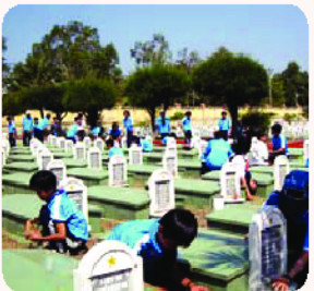 Các bạn trong hình đang chăm sóc, lau chùi những bia mộ liệt sĩ – một hành động đầy ý nghĩa, thể hiện lòng biết ơn sâu sắc của thế hệ hôm nay đối với các anh hùng đã hy sinh vì Tổ quốc. Những tấm bia không chỉ là biểu tượng của lịch sử, mà còn ghi dấu lòng yêu nước, niềm tự hào dân tộc, cùng tinh thần bất khuất, ý chí kiên cường chống giặc ngoại xâm của nhân dân Việt Nam.