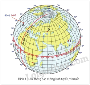Quan sát hình 1.3. hãy xác định và ghi lại tọc độ địa lí của các điểm D, E.