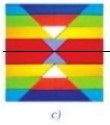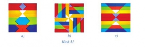 Trong Hình 51, các hình từ a) đến c), hình nào có trục đối xứng? Nếu là hình có trục đối xứng, hãy chỉ ra trục đối xứng của hình đó ( kể cả màu sắc)