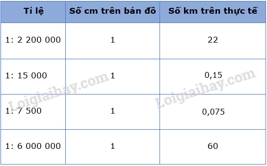 Hãy tính khoảng cách trên bản đồ và trên thực tế của các tờ bản đồ có tỉ lệ trong bảng sau: