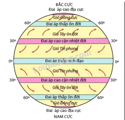 Hình 13.5. Phân bố các đai khí áp và một số loại gió thổi thường xuyên trên Trái Đất