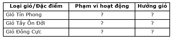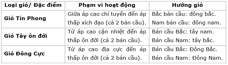 Quan sát hình 13.5, hãy hoàn thành bảng mô tả đặc điểm của các loại gió thổi thường xuyên trên Trái Đất theo mẫu sau: