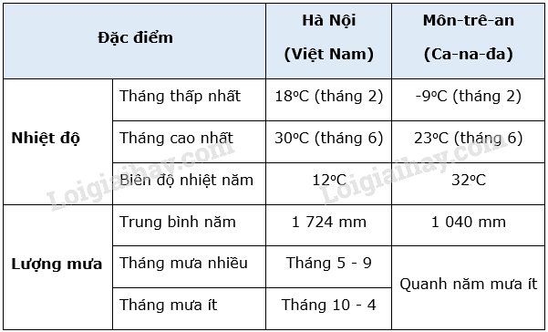 Quan sát hình 15.2, em hãy so sánh đặc điểm nhiệt độ và lượng mưa của Môn-trê-an (Montreal), Ca-na-đa và Hà Nội, Việt Nam.