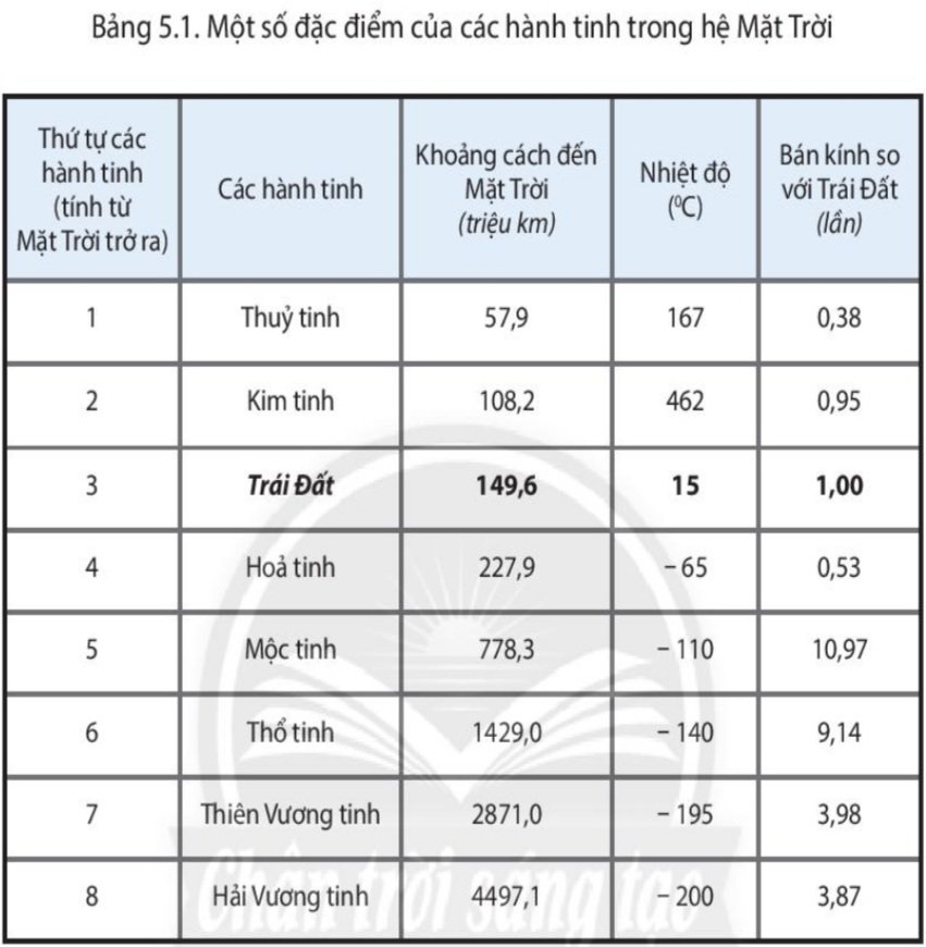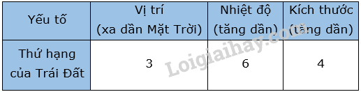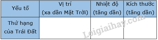 Căn cứ vào bảng 5.1, hãy sắp xếp thứ hạng của Trái Đất theo các tiêu chí: vị trí (xa dần Mặt Trời), nhiệt độ (tăng dần), kích thước (tăng dần) so với các hành tinh khác trong hệ Mặt Trời rồi điền vào bảng bên dưới.