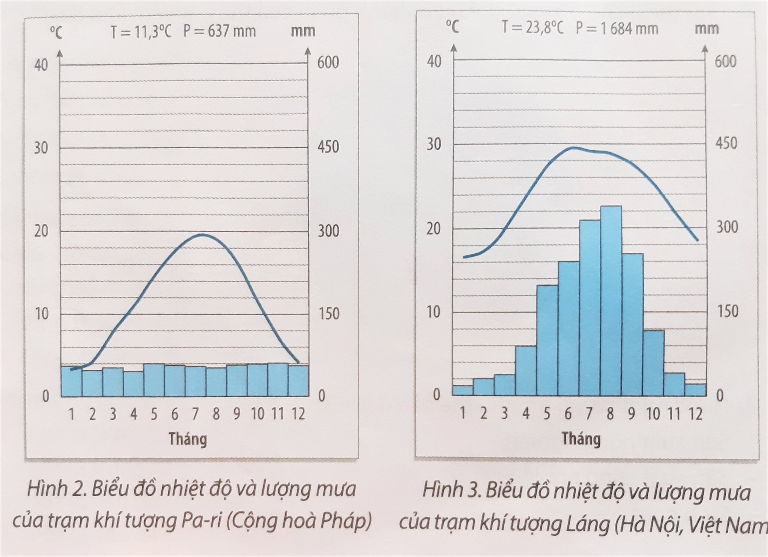Dựa vào biểu đồ dưới đây, nêu sự khác biệt về nhiệt độ và lượng mưa của hai trạm khí tượng Pa-ri và Láng.