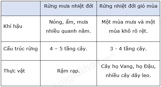 Hãy hoàn thành bảng theo mẫu sau để so sánh đặc điểm của rừng mưa nhiệt đới và rừng nhiệt đới gió mùa.