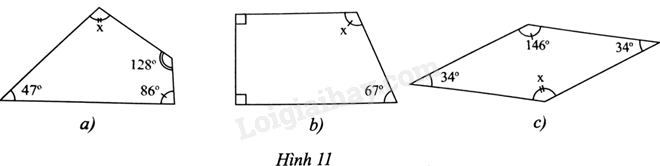 Hình 11a: \(x = {360^0} - {47^0} - {86^0} - {128^0} = {99^0}\)