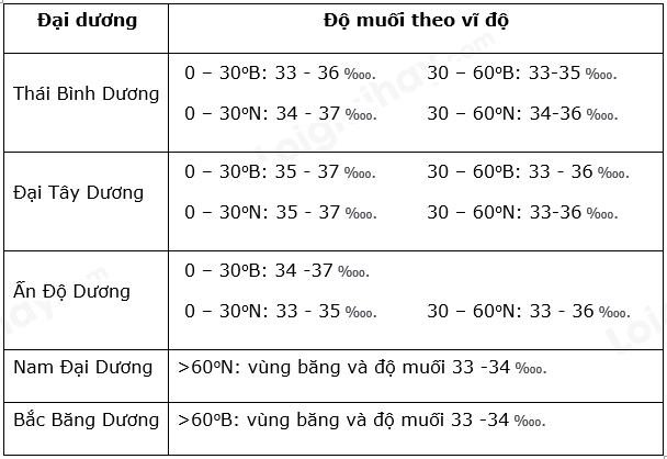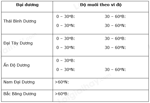 Dựa vào hình 18.1 trong SGK, hãy xác định độ muối tương đối của các đại dương theo vĩ độ và điền vào chỗ trống (...) trong bảng sau: