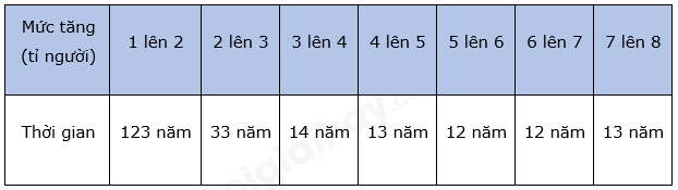 Dựa vào biểu đồ, tính thời gian dân số tăng thêm 1 tỉ người và ghi vào bảng theo mẫu sau. Nhận xét về tốc độ tăng dân số thế giới.