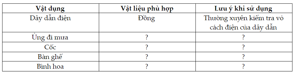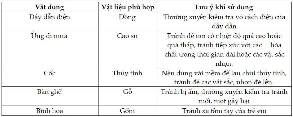 Các vật dụng có thể được tạo nên từ nhiều vật liệu khác nhau. Hãy chọn vật liệu phù hợp và nêu những lưu ý khi sử dụng theo gợi ý trong bảng sau: