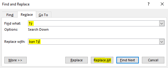 - Trong hộp thoại Find and Replace, nhập từ “Tý” trong ô Find what và nhập từ “bạn Tý" trong ổ Replace with, sau đó nháy nút lệnh Replace All để thay thế tất cả những từ tìm được.