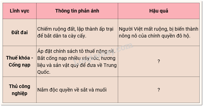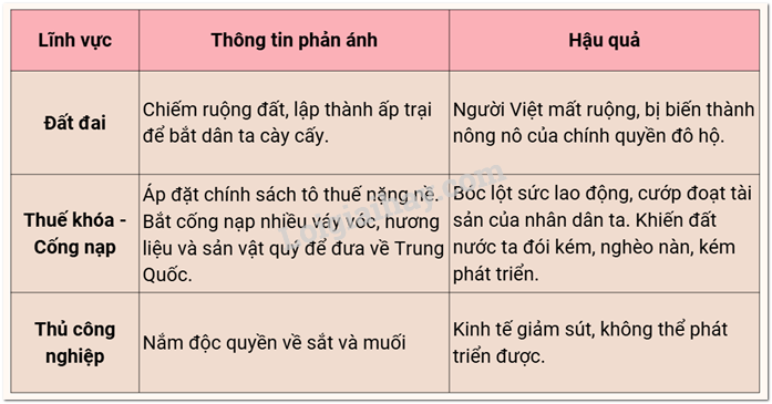 Em hãy cho biết chính sách cai trị của các triều đại phong kiến phương Bắc đối với nước ta (theo bảng dưới đây).