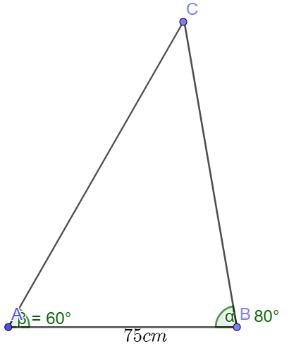 Cho tam giác ABC , biết cạnh \(a = 75\) cm, \(\widehat B = 80^\circ ,\widehat C = 40^\circ \)